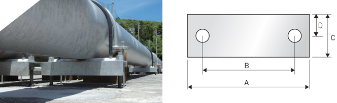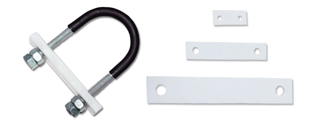 As a support for a slide that would fix teflon, which contains best fillings of the wear resistance pressing feature, to a metal plate with an additive or a screw, U-BOLT PAD efficiently smoothens movements caused by newly-built piping structures. It works with good waterproofing property and is tolerable not only to high temperature but also to low temperature. Outstanding chemical resistance keeps the pad away from effects caused by this environment that would rust metals.